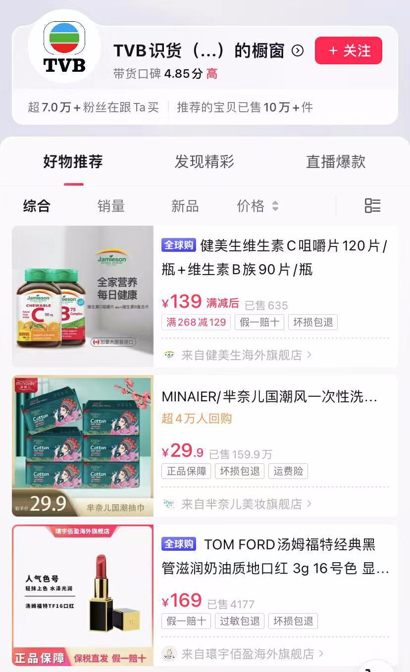 先是宇宙的尽头是带货,现在这个曾经活在云端的厂牌也没能逃过直播带货。目前,TVB共有3个带货账号,TVB识货(港星严选)、TVB识货(美味甄选)和TVB识货(港式甄选),前两者没有太大水花,粉丝都是10万左右。TVB识货(港式甄选)则是TVB今年4月重点打造的带货账号,虽然和东方甄选有着莞莞类卿的意味,但定位是在更热门的美妆护肤赛道,为了吸引消费者,TVB还不断安排旗下艺人出面,比如“师奶杀手”陈豪的出镜曾引得一众消费者下单。目前,该账号已有47.5粉丝,橱窗上架445件商品,已有超7万粉丝下单。