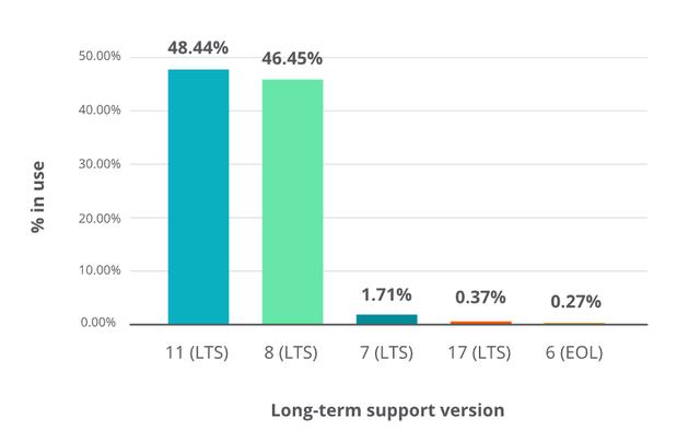 Java 11 的应用占比第一