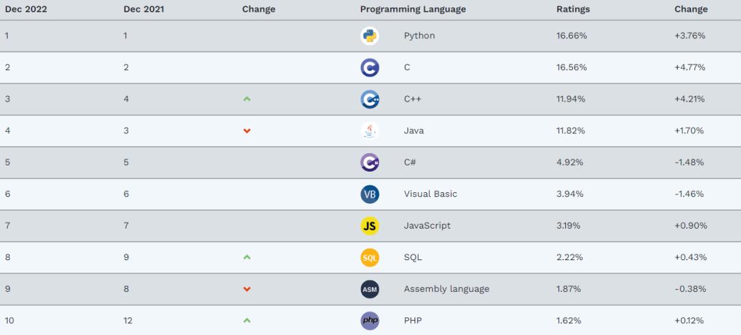日前,被誉为编程语言界“江湖百晓生”的TIOBE发布了2022年12月的编程语言排行榜,Python、C语言与C++位列榜单前三,而Java仅排名第四。