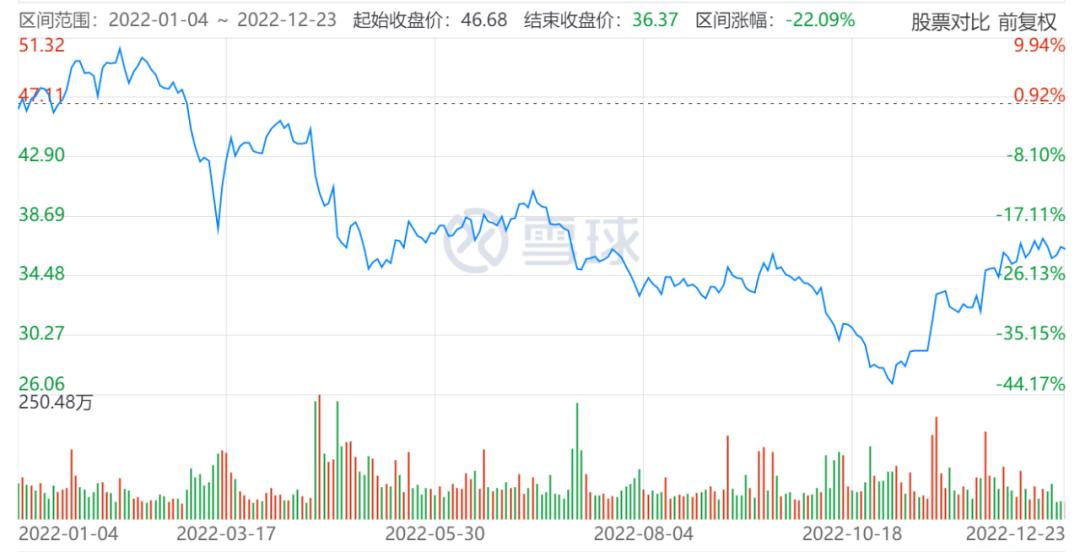 10月28日,招商银行收盘价报收27.18元/股,较历史最高点56.15元“腰斩”,总市值蒸发逾7300亿元。10月30日,招商银行迎来2022年最低价,收盘价仅为26.82元/股,年内降幅高达42.54%,已经抹去了2020年开年以来的所有涨幅。