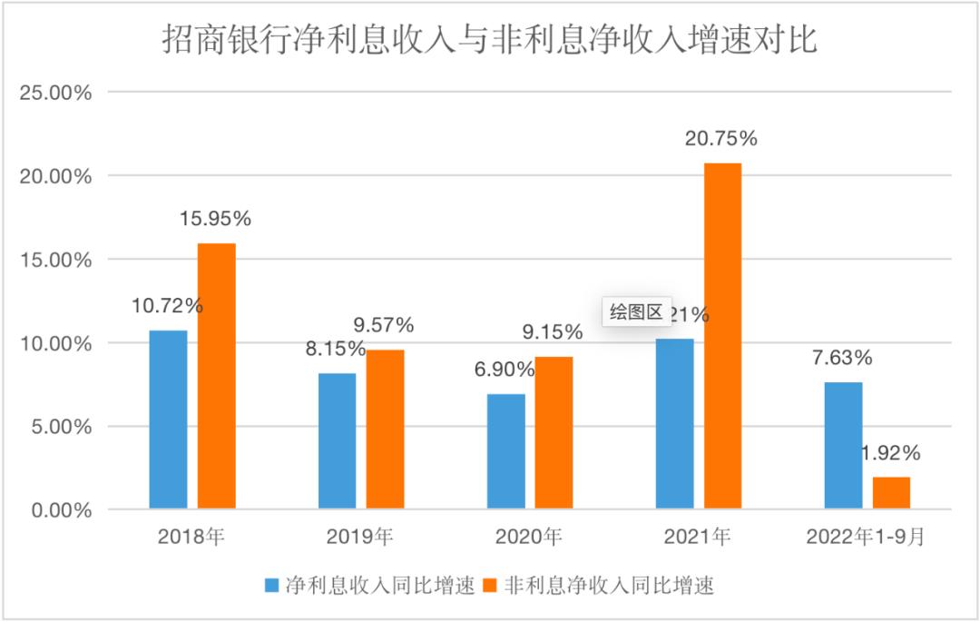 2018-2021年,招商银行的非利息净收入增速一直高于净利息收入。但是2022年情况却发生了变化。1-9月,招商银行的非利息净收入增速仅为1.92%,罕见地低于净利息收入7.63%的增速。