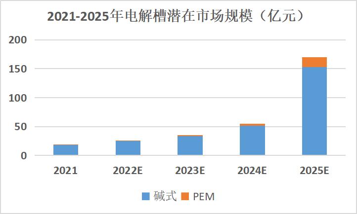 考虑未来工业、交通、电力储能领域的绿氢需求量,电解槽技术迭代以及降本空间,预计2025年电解槽累计装机将超15GW,市场规模将超150亿元。