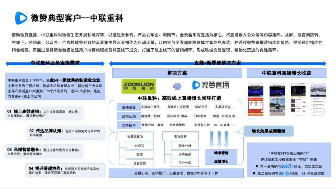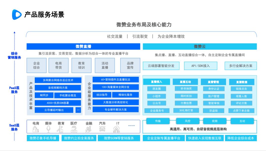 以场景体验为例,针对不同用户的特性——直播营销领域的用户更多关注引流获客效果、直播培训客户更注重培训效果指标, 微赞着重打磨“全链路”一体化服务, 在具体场景中“抓痛点”以及“深度定制”,在标准的SaaS基础上,衍生出PaaS化,全案化等“全家桶式”服务。
