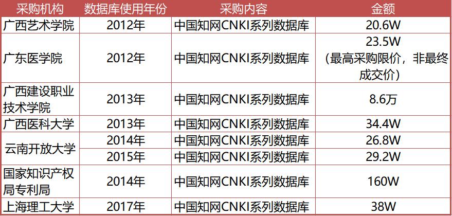 2012年12月,南京师范大学宣布,因“CNKI中国知网”数据库商家涨价过高,从2013年1月1日起暂停使用。此后2016年和2018年,北京大学、武汉理工大学、太原理工大学也先后发布公告,称停止使用知网。