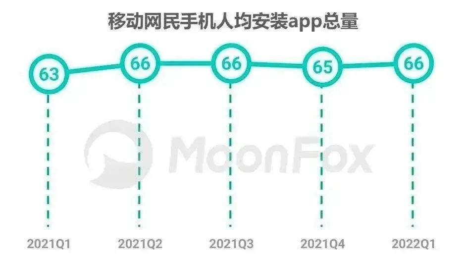 毕竟当下,人们对于新的APP的需求已经大大降低。根据极光大数据统计,2022年Q1人均安装APP的数量为66个。横向比对过去几个季度的数据,这个数字几乎是停滞的。某种程度上来说,这个结论可以印证另一个观点——头部的APP正在往超级APP的方向发展。