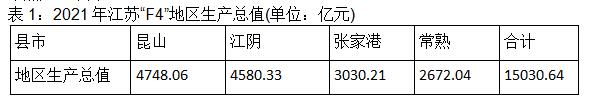 自2003年广东省南海、顺德撤市改区,成为佛山辖区退出县市竞争力排行榜后,昆山、江阴、张家港、常熟四市一直霸占中国百强县市排行榜前四,堪称中国县市经济发展“天花板”。由于四县市不仅地理空间上连成一片,而且1983年均为苏州地区管辖,因此,又可以“四小虎”相称。按照2021年地区生产总值衡量,江苏“四小虎”合计超过了15000亿元,可以排到全国所有城市前列,列十二位;在上海大都市圈“1+8”城市中,昆山、江阴超过了湖州、舟山,张家港、常熟超过了舟山。