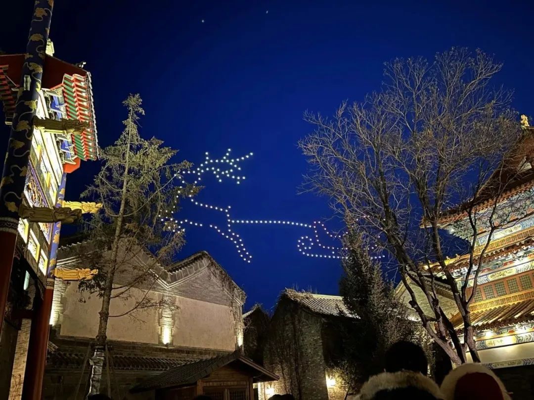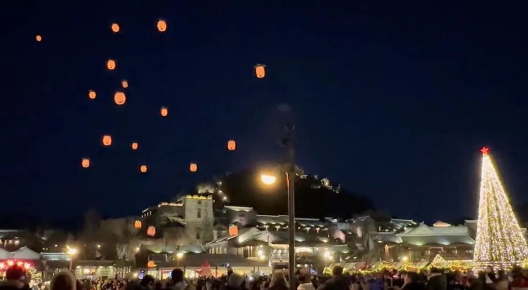 沉寂了许久的古北水镇在圣诞夜热闹起来,无垠深蓝的夜空中,亮着灯的无人机摆出了一颗圣诞树的形状,几十盏孔明灯缓缓升空,承载着新一年的愿望。