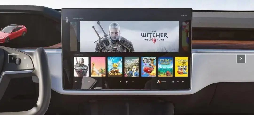 2021年,在Model S高性能版的宣传海报中,3A游戏大作《巫师3》被搬上了特斯拉的车机。今年2月,有记者问到马斯克,未来能否在特斯拉上玩《赛博朋克2077》,马斯克回答称,特斯拉的目标不是将某款游戏移植到车上,而是希望车内能运行所有Steam游戏。这个愿望,在时隔近一年后终于实现。