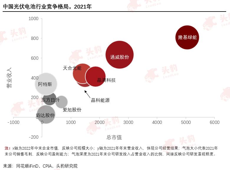 垂直一体化企业凭借显著的成本优势,逐步瓜分专业电池厂商市场份额。垂直一体化企业由于布局产业链多个环节,可以有效降低成本,平滑收益曲线。老牌专业电池厂商通威股份也在2022年布局组件环节,开始一体化布局。参考气泡图不难看出目前占据较强竞争优势的厂家皆为垂直一体化企业。