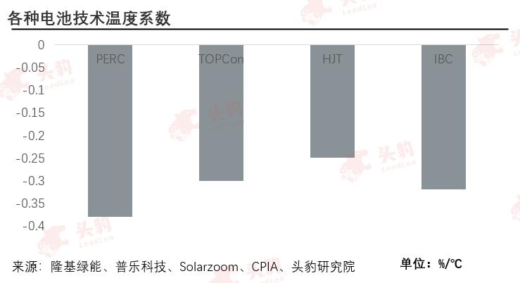 HJT电池温度系数绝对值最低,可以有效降低热损失。一般而言,太阳能电池的开路电压随温度的升高而降低。电池片标准的工作温度25℃,此时的电压为基准电压值。HJT电池温度系数约为-0.25%/℃,意味着电池片温度每升高1℃,HJT电池的电压将降低基准值的0.25%。换句话说,因为温度系数绝对值最低,HJT在高温环境下表现更为优异。