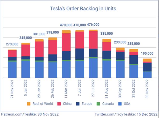 根据长期跟踪特斯拉的分析师 Troy Teslike统计的数字,特斯拉全球电动汽车订单积压量近月来一直在迅速减少,截至11月30日已降至19万辆,而这一数字大约对应着44天的产能。