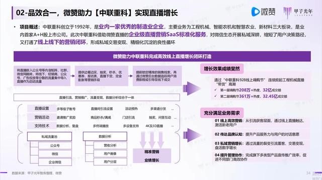 以企业直播营销领域第一梯队服务商微赞为例,凭借企业级直播营销SaaS和PaaS标准化服务,为企业获客和品牌营销提供全流程引流、互动、 变现工具,助力企业实现私域营销增长闭环。该业务定位于企业直播营销综合场景,集直播引流、营销推广、流量变现、数据分析于一体的标准化产品。同时,从芯象导播、直播一体机等专业直播软硬件解决方案,可帮助企业获客运营赋能,以期形成品效合一的直播营销增长生态。