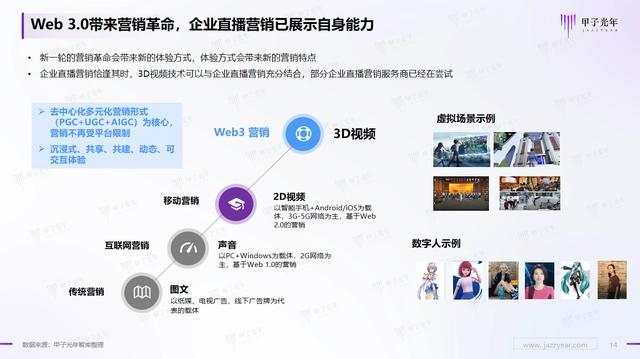 《白皮书》中提到,新一轮的营销革命会带来新的体验方式,体验方式会带来新的营销特点。随着传统营销到互联网营销,再到移动营销,最后到现阶段的Web3营销,传播体验方式也逐步从图文、声音、2D视频到3D视频递进。面对新一代互联网浪潮,各行各业数字营销形式的新业态不断涌现,Web3.0让“元宇宙”从概念走向现实,将为用户提供更高度的交互性和沉浸式感受。