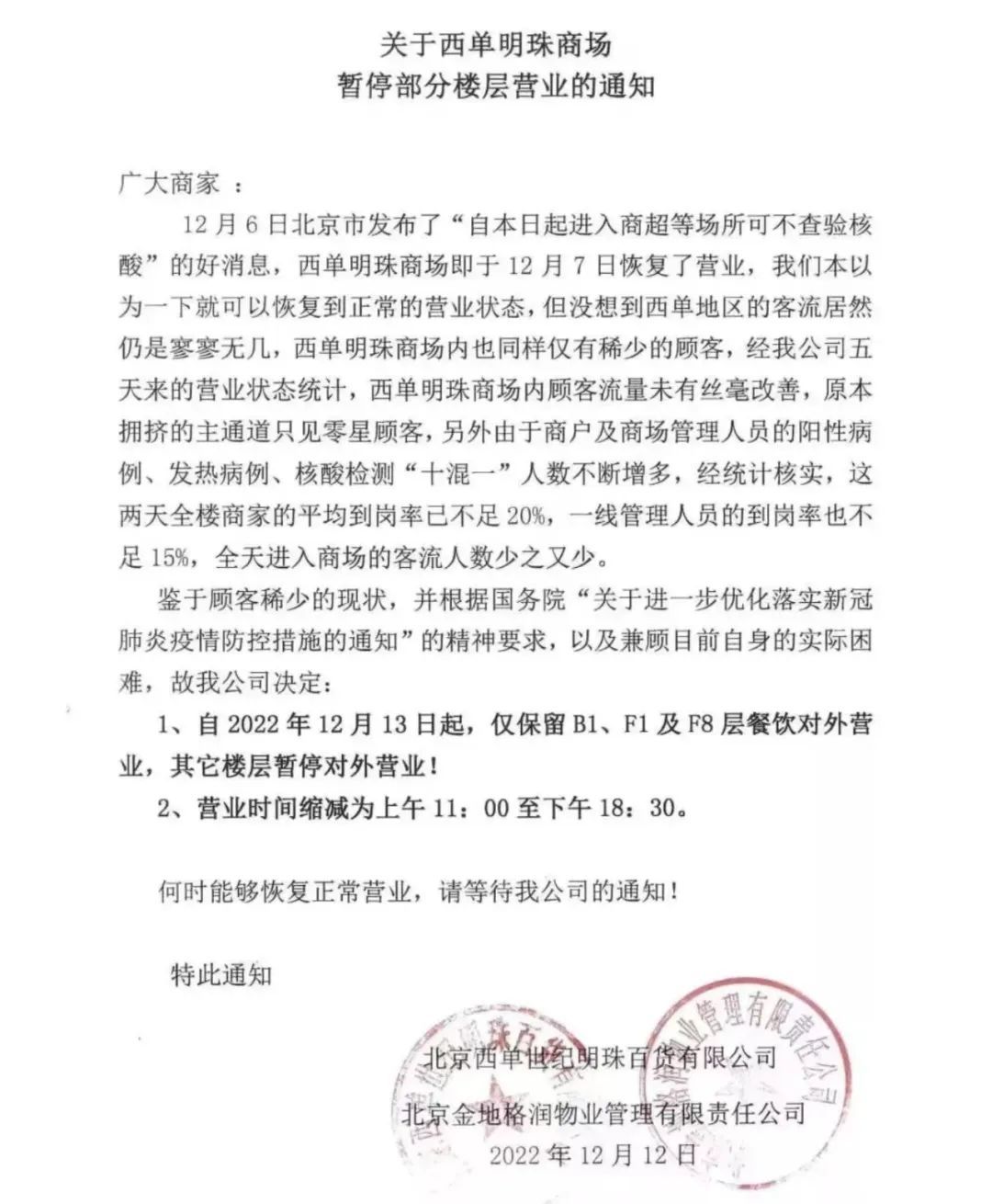 出行的人变少了,商场客流量也是“惨不忍睹”。12月14日,北京西单明珠商场在微博发布公告宣布,商场自12月7日恢复正常运营后未见客流恢复往日水平,且确诊的商户和商场管理人员日益增多,全楼商家平均到岗率不足20%,从12月13日起将仅保留少数餐饮楼层开放,营业时间也缩短至上午11点至下午18:30。