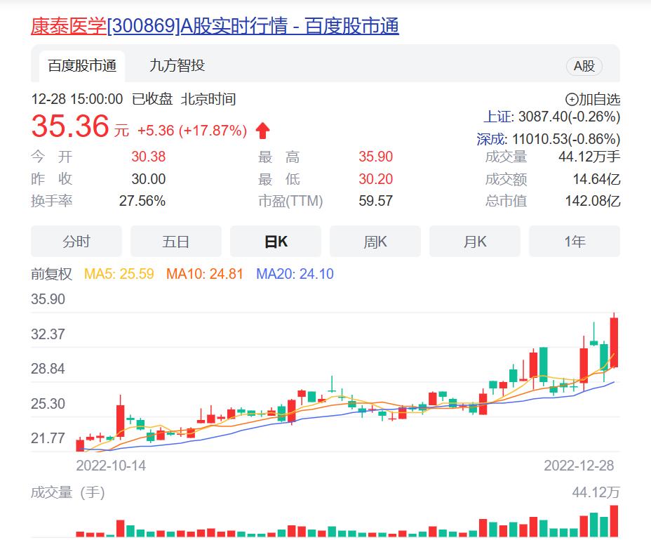 挽救康泰医学的救命稻草,再次出现。近几个交易日,其股价多次大涨。截至12月28日收盘,康泰医学报35.36元/股,市值回到142亿元。