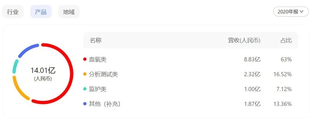 康泰医学的血氧仪一直是其主要营收来源,公司血氧类产品营收占比63.64%。2020年血氧类产品收入约8.83亿元,同比增长708.00%;分析测试类产品收入约2.32亿元,同比增长2714.77%。从销售情况来看,公司2020年血氧类产品销售量约1560.40万台,同比增长824.68%;分析测试类产品销售量约144.03万台,同比增长7538.57%。