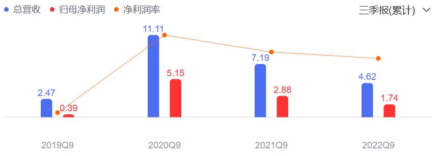 今年10月26日,康泰医学发布了2022年三季度报告,前三季度营业收入4.62亿元,比上年同期减少35.75%;归属上市公司股东的净利润为1.74亿元,比上年同期减少39.53%。当日市值跌到96亿元。