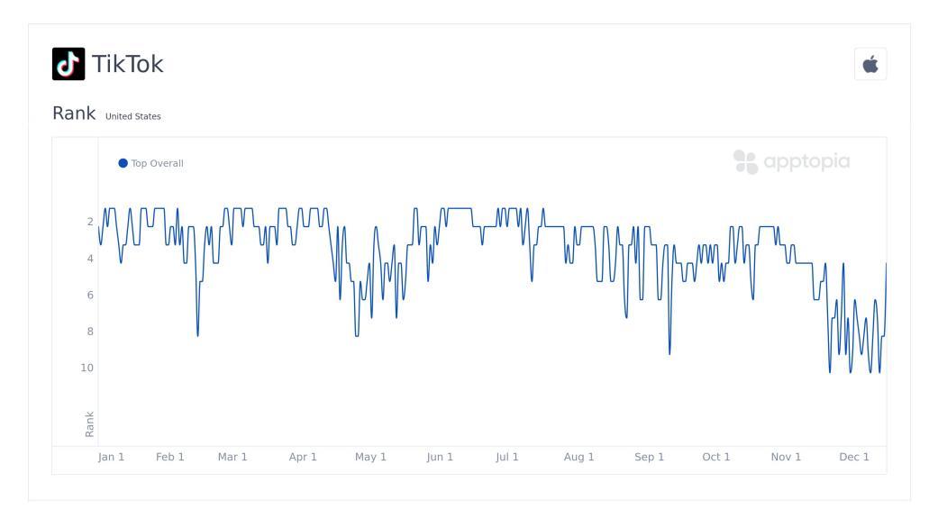 2022 年 TikTok 在美国 iOS 免费下载榜 上的排名变化趋势丨数据来源:Apptopia
