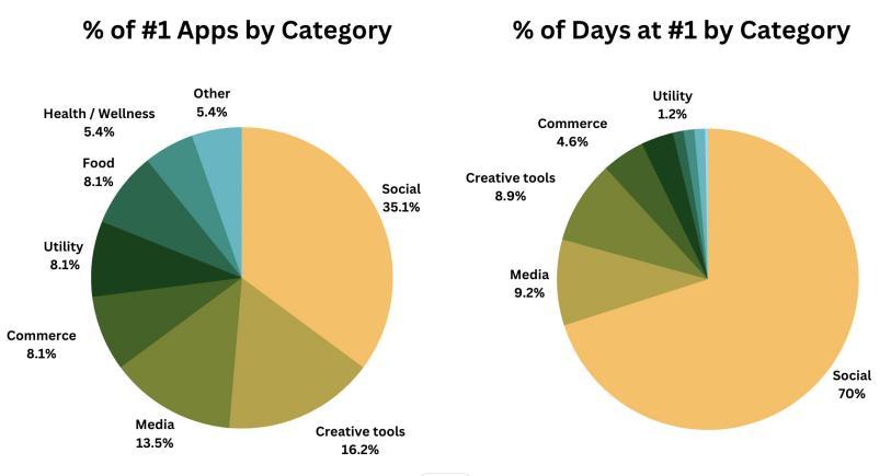 而来自中国和欧洲的 App 虽然登顶数量比来自美国的 App 少很多,但是生命力更强,数据显示来自这两个地区的 App 登顶美榜的天数占到了总天数的 60%。