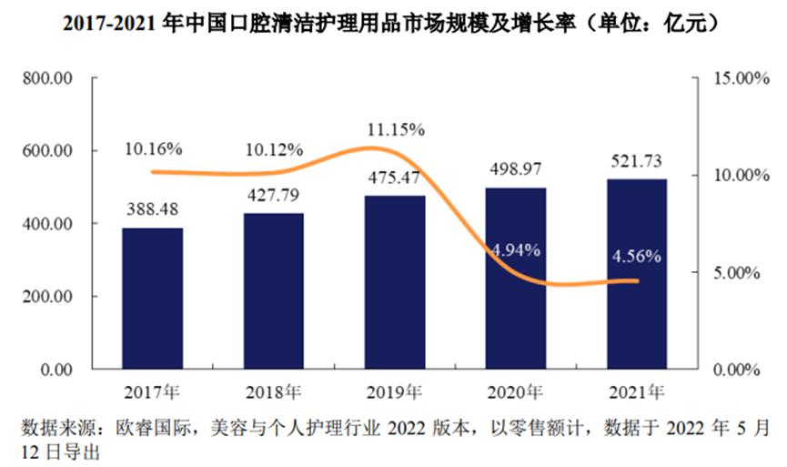 欧睿数据显示,2017-2021年我国口腔清洁护理用品行业市场规模年均复合增长率为7.65%,2021年市场规模为21.73亿元。但自2020年开始,口腔清洁护理用品市场增速明显放缓,增长率低于5%。