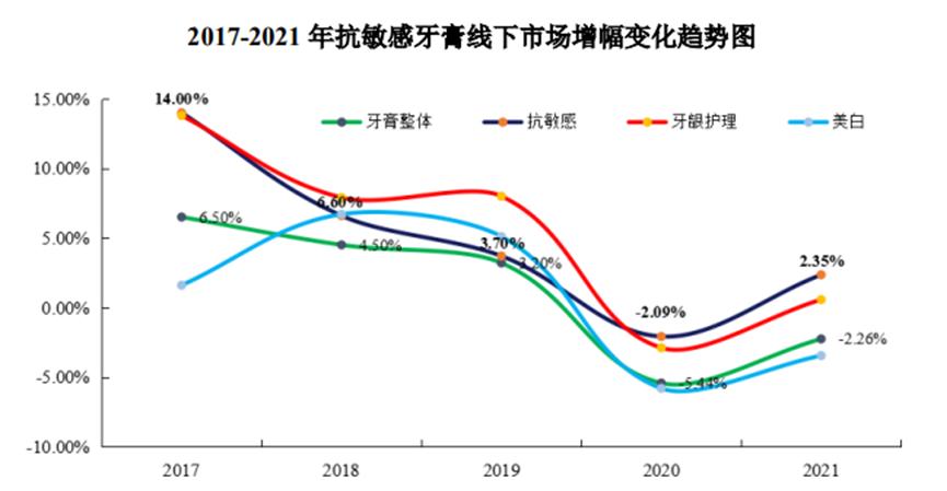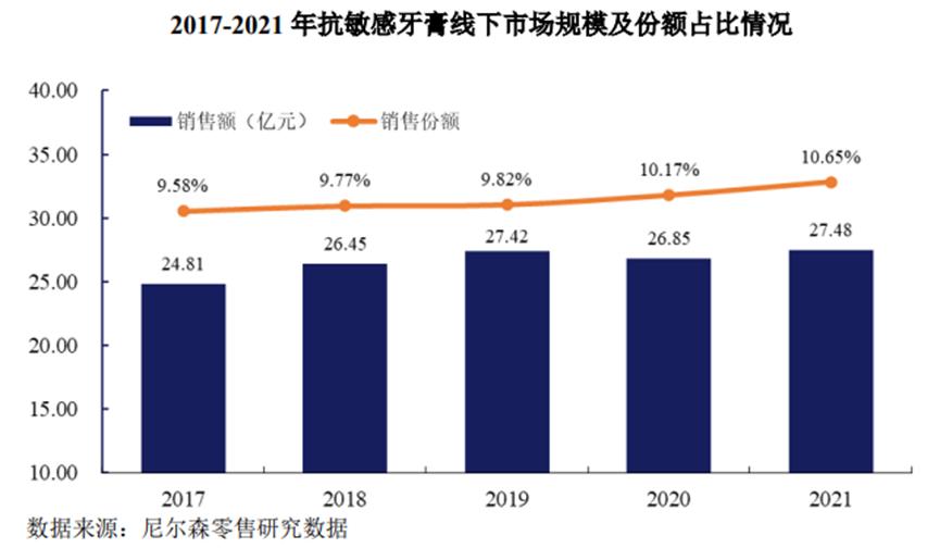 据尼尔森零售研究数据显示,在牙膏整体增速放缓甚至陷入负增长的背景下,抗敏感牙膏市场份额在2017年-2021年持续增长,且增速高于牙膏行业整体和美白、牙龈护理细分品类。2021年我国线下渠道抗敏感牙膏的市场零售规模达27.48亿元,成为牙膏品类中第三大线下细分市场,市场份额占比达到10.65%。