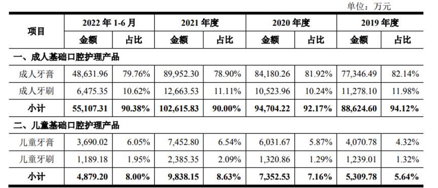 分品类来看,成人基础口腔护理产品(成人牙膏和成人牙刷)是登康口腔的主要收入来源。招股书显示,2019年-2022年上半年,公司成人基础口腔护理产品分别实现营收8.86亿元、9.47亿元、10.26亿元和5.52亿元,在主营业务收入的占比分别为94.12%、92.17%、90.00%和90.38%。