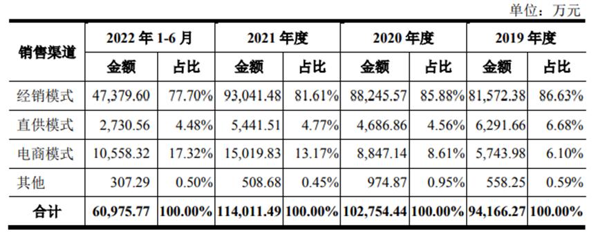 分渠道来看,登康口腔的销售模式以经销模式为主,报告期内经销模式收入占比均在80%左右。2019年-2022年上半年,登康口腔经销模式收入占比分别为86.63%、85.88%、81.61%和77.70%;电商模式收入占比则分别为6.10%、8.61%、13.17%和17.32%。对此,登康口腔表示,报告期内公司经销模式收入稳步增长,收入占比略有下降,主要原因系公司积极开拓电商业务,电商模式收入快速增长所致。