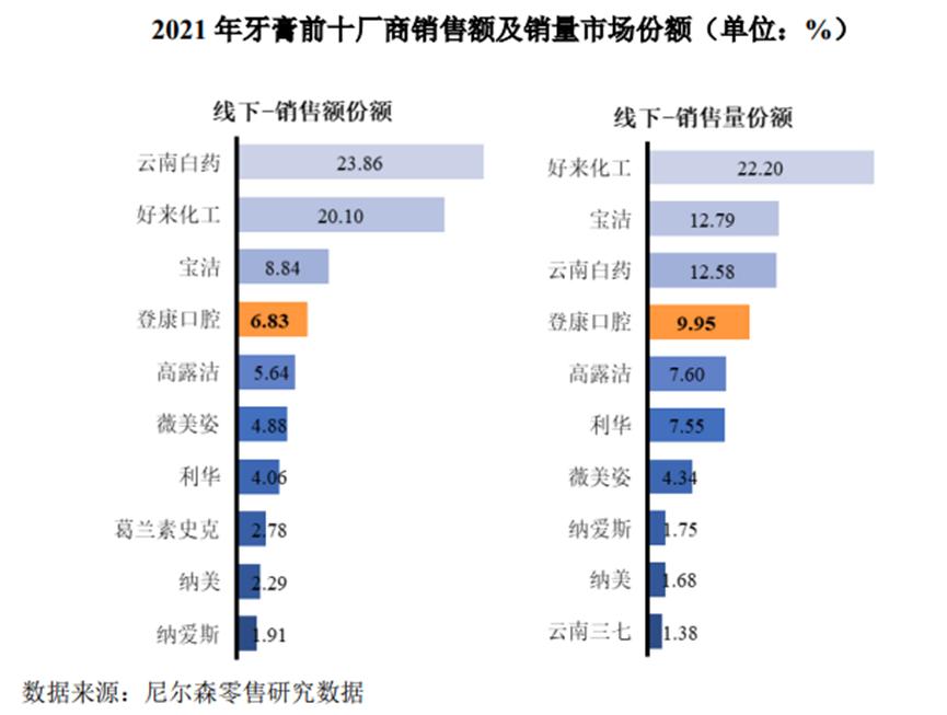 尼尔森零售研究数据显示,我国牙膏品类市场相对集中,2021年牙膏产品按全渠道零售额计,前十厂商市场份额合计达75%,云南白药、好来、宝洁、登康口腔(冷酸灵)、高露洁等前五厂商市场份额达59.50%,头部效应日趋显著,头部企业市场规模更加突出且展现了良好的市场品牌效应。