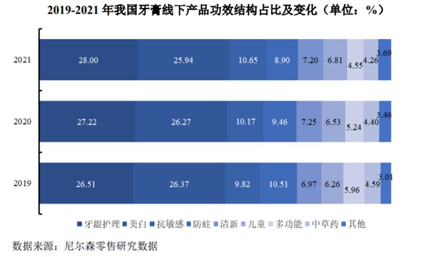 对比来看,传统的美白类牙膏的市场份额在2019年-2021年间持续萎缩,牙龈护理、抗敏感和儿童等强功效、高溢价的功能品类市场规模持续提升。