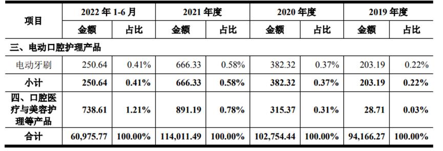 2022年上半年,登康口腔儿童牙膏产品和儿童牙刷产品在主营业务收入的占比分别为6.05%和1.95%;而电动口腔护理产品(即电动牙刷)和口腔医疗与美容护理等产品的收入占比分别为0.41%和1.21%。