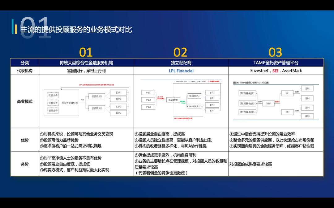 以EnvestNet,AssetMark为代表的TAMP全托资产管理平台,其优势在于能够通过中后台提高展业的效率,整合多元的服务商,快速占领市场份额。其劣势在于,对投顾的成熟度要求较高。