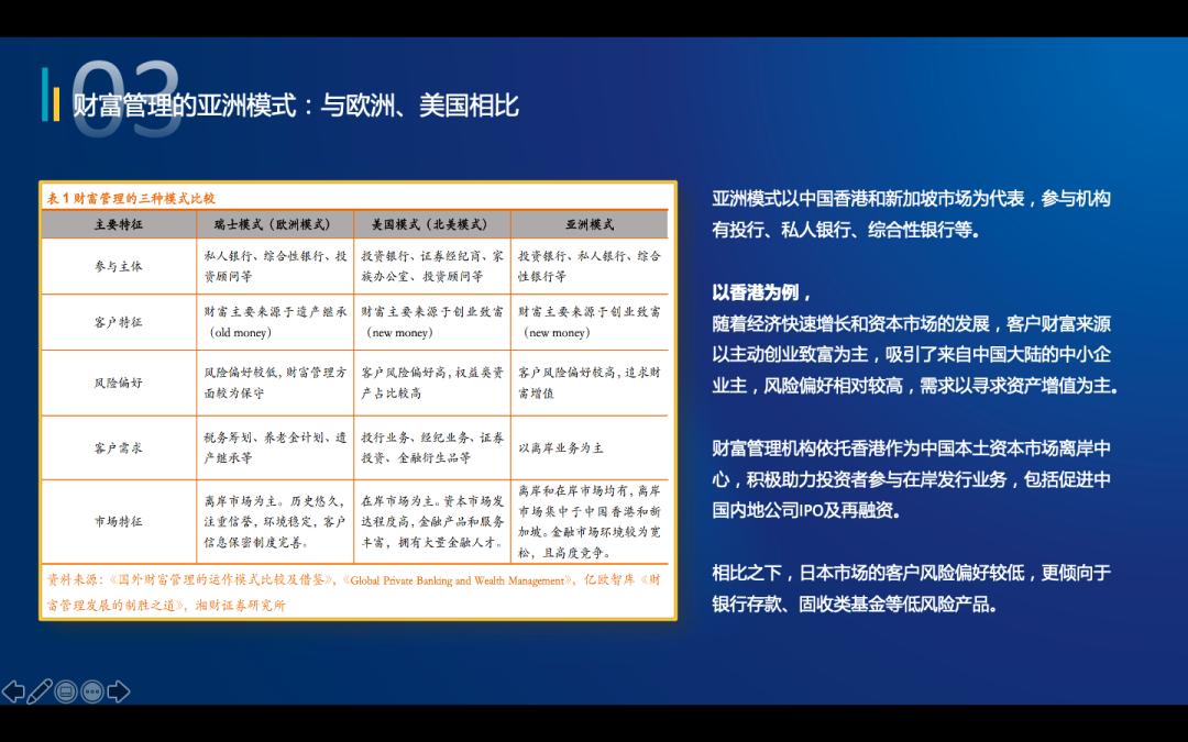 与欧洲、美国市场相比,亚洲的财富管理模式以中国香港和新加坡市场为代表,参与机构有投行、私人银行、综合性银行等。
