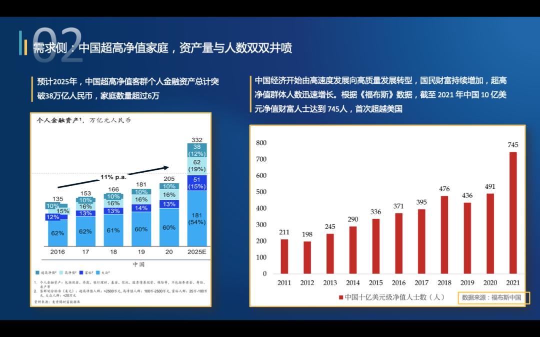 其中,在需求侧,中国超高净值家庭的资产量与数量双双井喷。预计2025年,中国超高净值客群个人金融资产总计突破38万亿人民币,家庭数量超过6万。