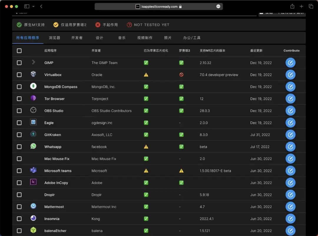 有位叫 Abdullah Diaa 的开发者创建了一个名为「Is Apple Silicon ready?」的网站,对目前大部分专业类软件进行了一番梳理,开发、设计、音乐、视频、办公应有尽有,详细标注了各类软件的适配情况,如果有兼容性方面的担忧,可以前往查询。网址为: https://isapplesiliconready.com/
