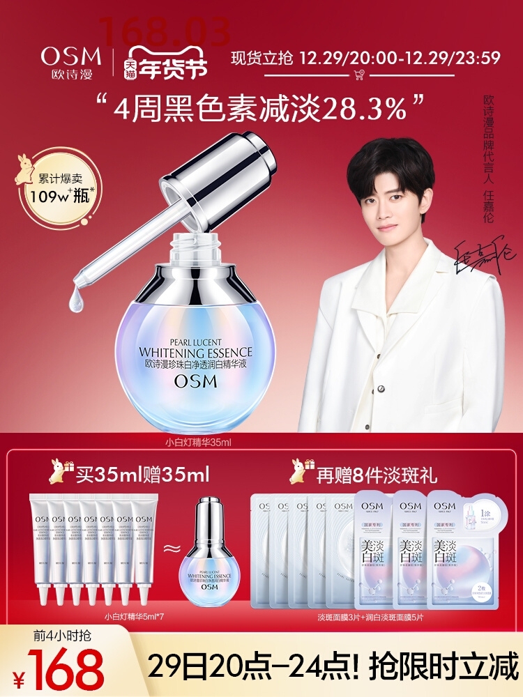 2018年下半年,欧诗漫上线了主打烟酰胺和珍珠多肽的第一代小白灯精华。Olay、欧莱雅等品牌的知名美白产品,均在200-400元内的价位,小白灯在同样主打烟酰胺的情况下,日常售价168元,且买一送一。