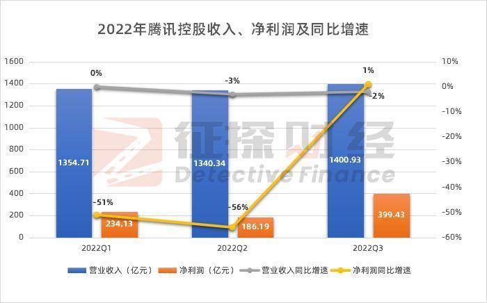 第一季度,腾讯营收1354.71亿元、同比持平,净利润234.13亿元、同比下滑51%;第二季度,营收1340.34亿元、同比下滑3%,系上市以来首次下滑,净利润186.19亿元、同比下滑56%;第三季度,营收1400.93亿元、同比下滑2%,净利润399.43亿元、同比增长1%。
