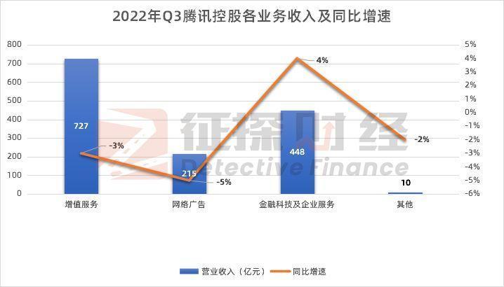 各板块业务也不尽如人意。在第三季度,腾讯增值服务业务同比下降3%至727亿元,其中国际市场游戏收入增长3%至117亿元,本土市场游戏收入下降7%至312亿元,社交网络收入下降2%至298亿元;网络广告业务同比下降5%至215亿元;金融科技及企业服务业务同比增长4%至448亿元。