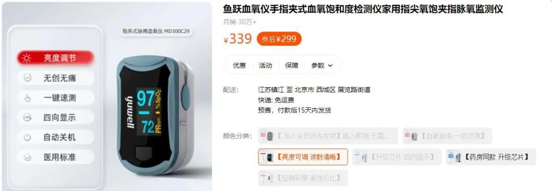 在电商平台上,多数血氧仪都显示售罄或预售。例如在淘宝销量第一的鱼跃指夹式血氧仪,一共6款产品,目前仅有2款在售,且皆为预售模式,付款后15天内发货。