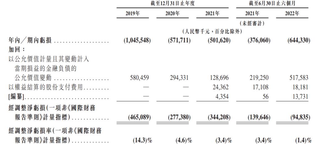 看起来形势大好,然净利仍是亏损,且是连年亏损。招股书显示,公司于2019年、2020年及2021年以及截至2022年6月30日止六个月,公司的亏损分别为人民币10.46亿元、人民币5.72亿元、人民币5.02亿元及人民币6.44亿元。三年半时间,共亏损近28亿元。