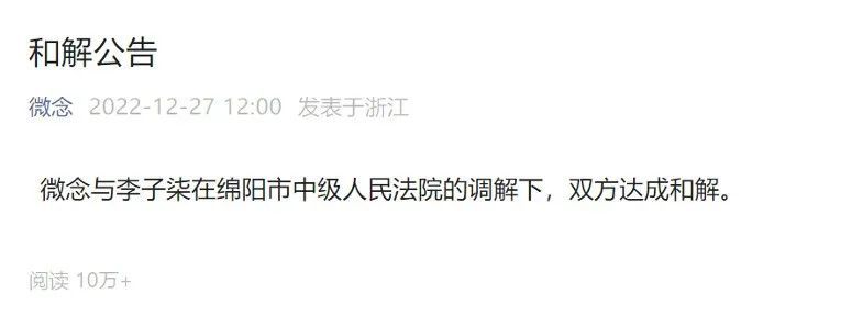 12月27日,微念公众号发布声明:“微念与李子柒在绵阳市中级人民法院的调解下,双方达成和解。”