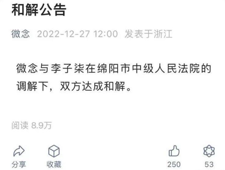 在停更了长达531天之后,微念与李子柒的纠纷终于在日前尘埃落定。12月27日,“微念”官方微信公众号发布消息称,“微念与李子柒在绵阳市中级人民法院的调解下,双方达成和解”。此外根据工商信息显示,四川子柒文化传播有限公司近期发生多项工商变更,其中监事由刘同明变更为蒲倩云,杭州微念品牌管理有限公司持股比例由51%减至1%,李子柒持股比例则由49%增至99%。