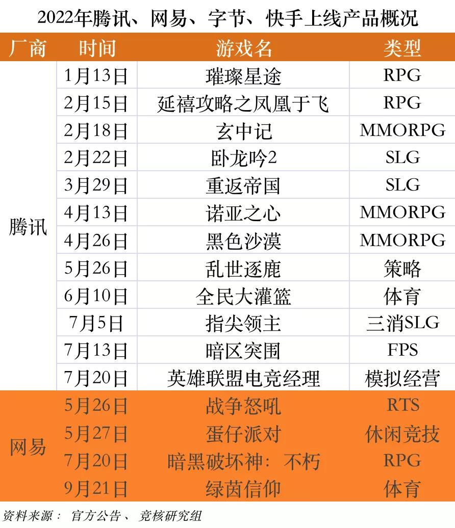 涉及厂商包括腾讯、网易、B站、快手、吉比特、盛趣、紫龙、厦门勇仕、中手游等,产品品类涵盖了MMO、SLG、ARPG、模拟经营、策略卡牌、Roguelike等。