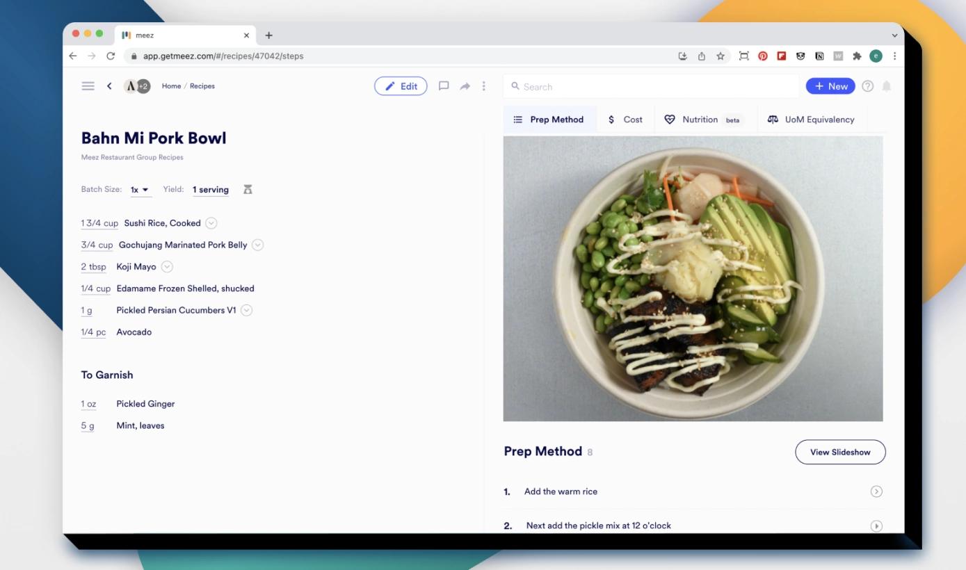 「meez」是一款专为餐饮企业设计的食谱管理应用程序。创始人兼首席执行官Josh Sharkey于2020年创办该公司,希望帮助餐饮从业者以数字化的方式管理和执行食谱编制、生产流程标准化和开展组织培训。