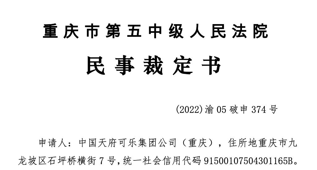 快消君获取的一份“(2022)渝05破申374号”裁定书显示:2022年5月,天府可乐集团曾以不能清偿到期债务且明显缺乏清偿能力为由,向重庆市第五中级人民法院申请破产清算。