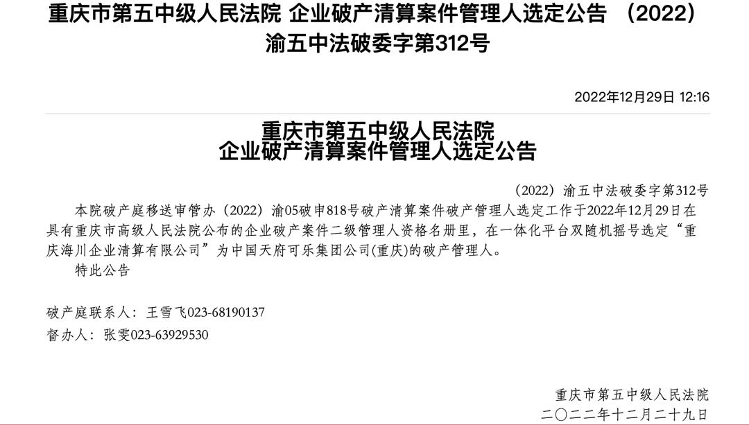 重庆市第五中级人民法院发布《企业破产清算案件管理人选定公告》显示,本院在审理关于(2022)渝05破申818号申请人重庆轻纺资产管理有限公司申请被申请人中国天府可乐集团公司(重庆)破产清算一案过程中,决定采取随机摇号方式产生破产管理人,并最终选定“重庆海川企业清算有限公司”为中国天府可乐集团公司(重庆)的破产管理人。
