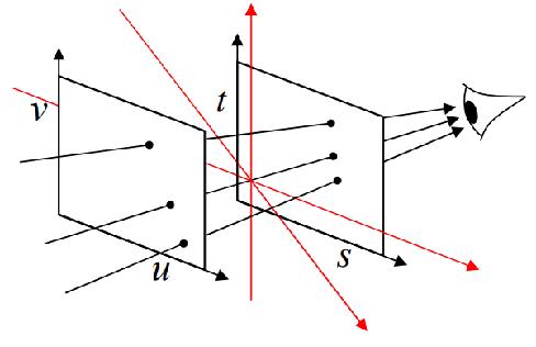 光场采集—4D光场模型 P(u,v,s,t):按照当前的计算机技术水平,难以对7D光场这么庞大的数据进行实时处理和传输。因此有必要对7D光场进行简化降维。美国斯坦福大学的Marc Levoy将全光函数简化降维,提出(u,v,s,t)4D光场模型[9]。Levoy假设了两个不共面的平面(u,v)和(s,t),如果一条光线与这两个平面各有一个交点,则该光线可以用这两个交点唯一表示。Levoy提出的4D模型既降低了表示光场所需的维度,同时又能完备表示人眼成像所需要的全部光线。光场4D模型得到了学术界的广泛认可,关于光场的大量研究都是在此基础上展开。