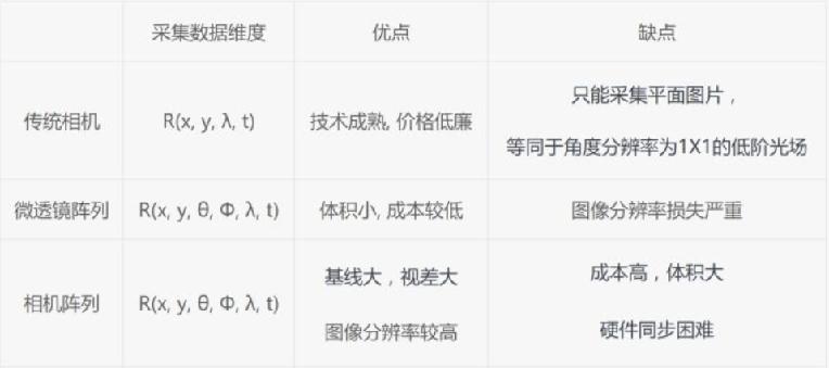 Google Project Starline基于4D光场模型的光场相机方案比较:基于微透镜阵列的光场采集具有体积小巧,硬件成本低等优点。但其缺点也很明显:1)光场视点图像分辨率损失严重,随着视点数量的增加,单个视点分辨率急剧降低。2)受到相机光圈的限制,光场中可观察的视差范围较小。基于相机阵列的光场采集相比基于微透镜阵列的光场采集具有更多优点:1)视点分辨率不损失,由单个相机成像传感器决定。2)光场的视差范围更大。但基于相机阵列的光场采集仍然面临两个问题:1)需要的相机数量较多,硬件成本高昂,例如采集7x7视点的光场需要49个相机。2)相机同步控制复杂,数据量大,存储和传输成本高。