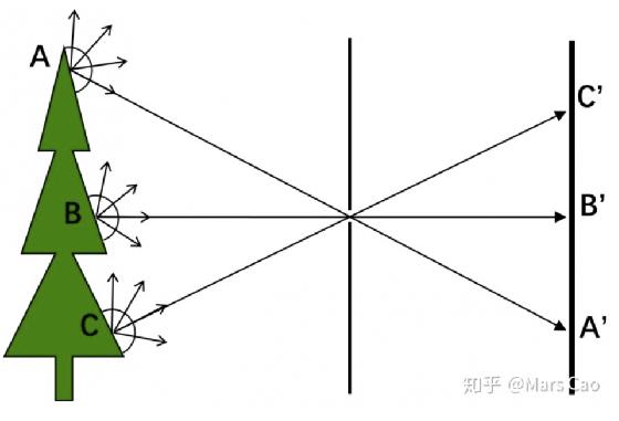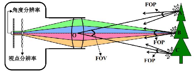 衡量4D光场的指标不仅有图像分辨率和视场角FOV,还有角度分辨率(表征了一个发光点在FOP角范围内的光线被离散化的程度, 图中B点在FOP角度范围内的光线被微透镜分成4x4束光线,光场相机的角度分辨率即为4x4,而基于小孔成像模型的普通相机的角度分辨率始终为1x1)和视差范围FOP(Field Of Parallax, 被光场相机采集到的光线的角度范围决定了能够观察的最大视差范围,我们记这个角度为FOP )。