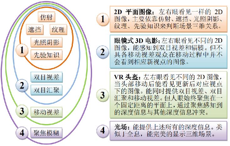 虚拟现实(VR)的成像光路示意图P(x,y, θ, Φ ,λ,t)没有z深度信息(光线都来自于同一个平面)通过6DOF传感器感知人的移动提供对应的影响,模拟各向异性的光线信息( θ, Φ )仍然缺乏聚焦模糊,和双目视差、移动视差产生冲突导致VAC难题。例如,真实环境中人眼看到远处的高山和近处的人物是分别接收了从远近不同地方发出的光线,然而VR屏幕中出现的高山和人物都是从距离人眼相同距离的显示屏上发出的光线。无论人眼聚焦在“远处”的高山还是“近处”的人物,睫状肌都是处于相同的屈张程度,这与人眼观看实际风景时的聚焦模糊状态是不相符的。随着显示技术的演进,显示设备能提供越来越丰富的视觉感知信息。根据所能呈现的视觉信息,可以将显示设备分为4个等级。