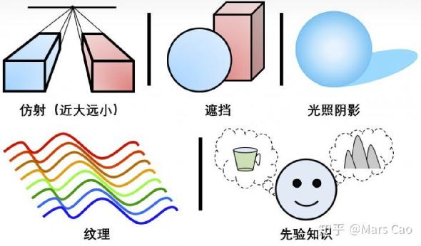 人眼产生三维立体视觉来源于 心理感知和 生理感知。 心理感知主要是通过仿射、遮挡、光照阴影、纹理、先验知识五方面的视觉暗示,从而“欺骗”大脑感知到三维信息,如图所示,尽管是在平面上绘图却能产生一定的三维视觉。 仿射:其直观的感受是“近大远小”,随着物体与人眼的距离减小,物体在人眼的成像越大。 遮挡:更近的物体会遮挡更远的物体,通过相互遮挡关系可以判断物体间的相对远近关系。 光照阴影:不同方向的光照会在物体表面产生不同的阴影,通过对阴影模式的判断可以推断物体的三维形状。 纹理:通过有规律重复的动/静态特征分布产生立体视觉。 先验知识:人类在观看大量物体以后会总结一些基本的经验,例如天空中的飞机和风筝都非常小,但飞机比风筝距离人眼更远。立体视觉的生理感知主要包括双目视差、移动视差、聚焦模糊双目视差(Binocular Parallax):人的双眼在水平方向上间隔大约 53~73mm, 由于左右眼的间隔,场景中的同一物体在左右眼视网膜上的成像位置会略微不同, 这种视网膜上成像位置的差距称为双目视差。为了避免左右眼视差所产生的重影,人眼会动态的调节视线的汇聚方向。通过双眼汇聚的角度可以判断物体的远近。双目视差的感知必须依靠双目协同工作才能完成。
